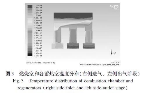 量, 因此在豎直方向蓄熱體和氣體都呈現(xiàn)出明顯的溫度梯度。同時, 當(dāng)進氣排氣方向發(fā)生變化時, 燃燒室內(nèi)溫度也會出現(xiàn)波動, 且分布不均勻。對于燃燒室結(jié)構(gòu), 也有裝置將燃燒室頂部兩側(cè)的直角改為切角, 使得煙氣湍流充分, 減小低溫區(qū)出現(xiàn)的可能性